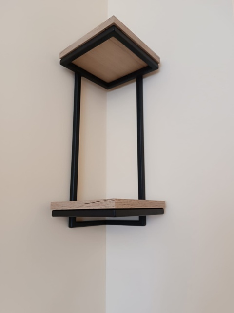Narożny kwietnik o prostym, nowoczesnym designie, idealnie wpisujący się w styl loftowy. Składa się z dwóch półek, zamocowanych na metalowym stelażu w kolorze czarnym mat z drobna strukturą. Każda półka jest wykonana z płyty laminowanej w wybranym kolorze, co kontrastuje z ciemnym stelażem.